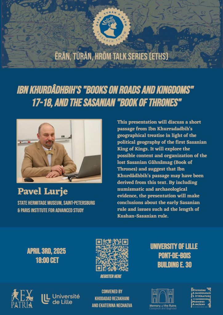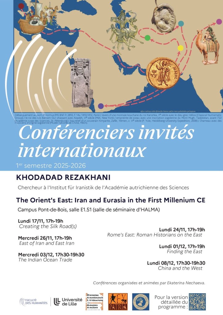 Starting on 17 November, Dr. Rezakhani’s will deliver a series of talks under the general title of The Orient’s East: Iran and Eurasia in the First Millennium CE as an invited speaker/lecturer at the University of Lille’s Histoire, Archéologie et Littérature des Mondes Anciens (HALMA), invited by Dr. Ekaterina Nechaeva’s Ex-Patria project and sponsored by the Faculté des Humanités.
